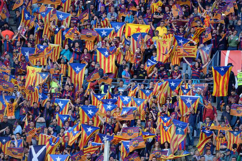 Selain mengibarkan bendera, sebagaimana biasanya dalam laga kandang Barcelona, para fan akan meneriakkan yel-yel kemerdekaan Katalan pada menit ke-17 dan detik ke-14. Aksi itu sengaja dilakukan untuk menandai pengepungan Kota Barcelona yang terjadi pada 1714. (Reuters)