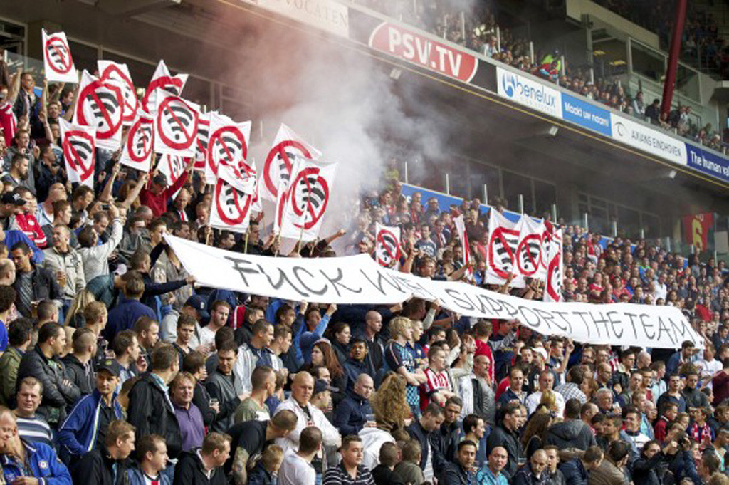 Salah satu spanduk yang dibawa pendukung PSV berbunyi, "Fuck Wi-Fi, support the team!"