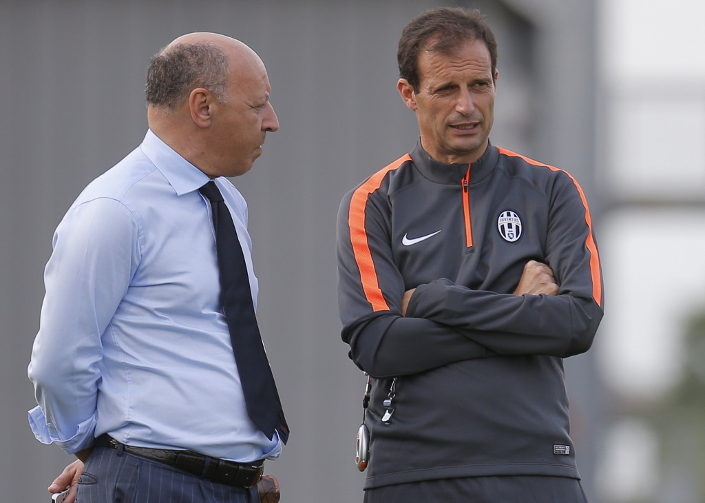 Kebersamaan Direktur Juventus Giuseppe Marotta (kiri) dengan pelatihnya Massimiliano Allegri. (AFP PHOTO / MARCO BERTORELLO