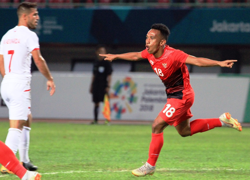 Irfan Jaya (kanan) selebrasi setelah memasukkan bola ke tim Palestina. (Foto: INASGOC/Hery Sudewo)