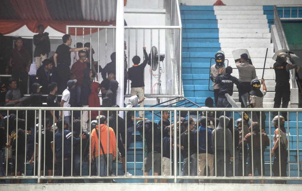 Kericuhan tersebut terjadi pada menit ke-30. Saat itu, suporter kedua tim saling melempar berbagai benda seperti botol air minum kemasan hingga pecahan lantai keramik di tribun barat dan selatan.