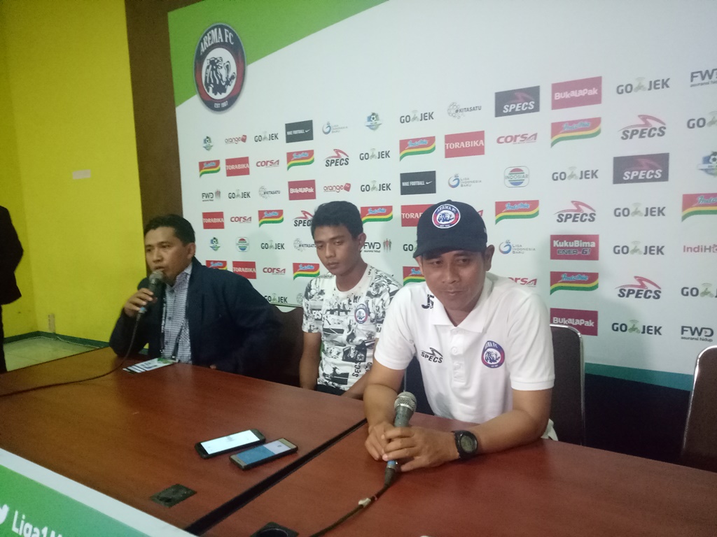 Pelatih Arema FC, Joko Susilo saat konferensi pers usai pertandingan. (Foto: medcom.id/Daviq Umar)