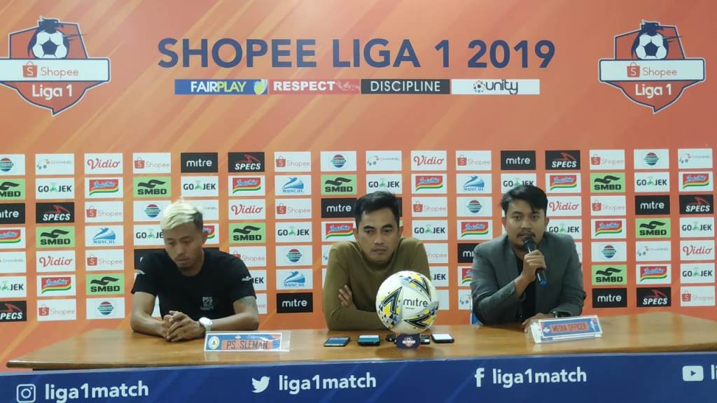 Pelatih PSS Sleman, Seto Nurdiyantoro (tengah), memberikan keterangan pada konferensi pers usai laga kontra PSM Makassar (Medcom.id/Mustaqim)