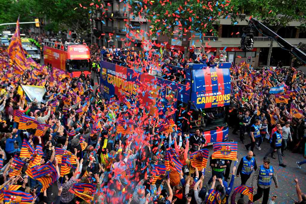 Sehari setelah menyegel gelar La Liga ke-25 mereka dan ketujuh dalam 10 musim, Barca memamerkan dua piala mereka di atas bus terbuka melalui jalan-jalan kota.