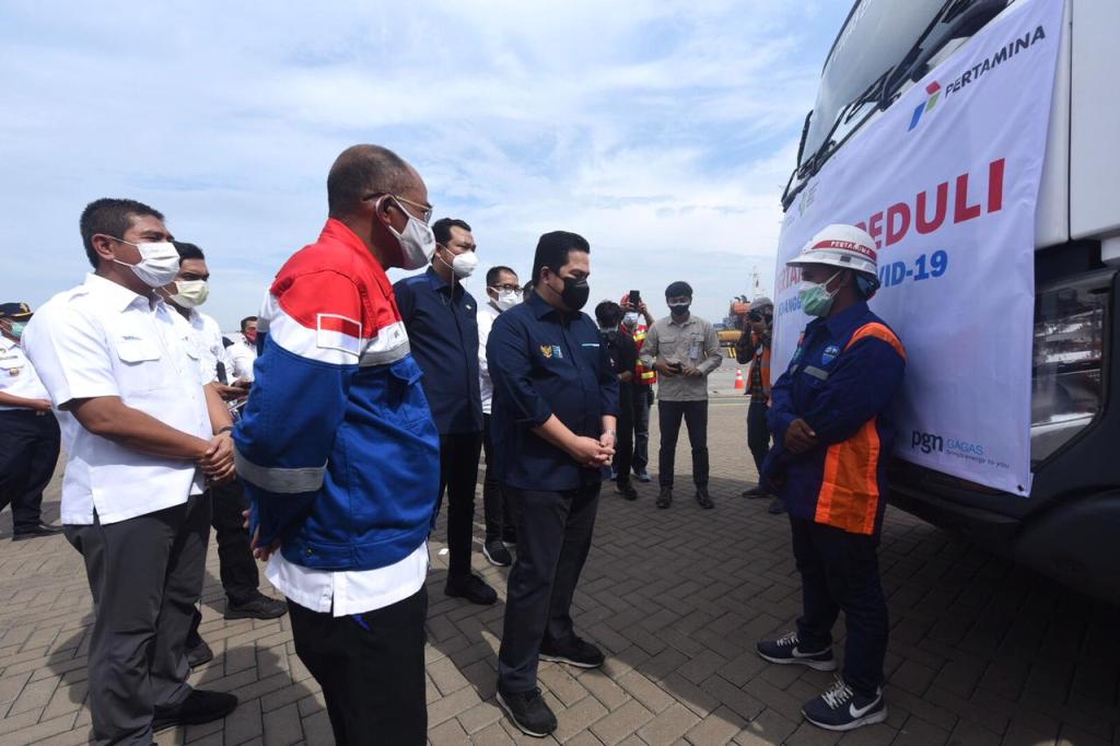 Menteri BUMN Erick Thohir meninjau langsung kedatangan enam isotank di Tanjung Priok, Jakarta Utara. Foto: dok. Pertamina