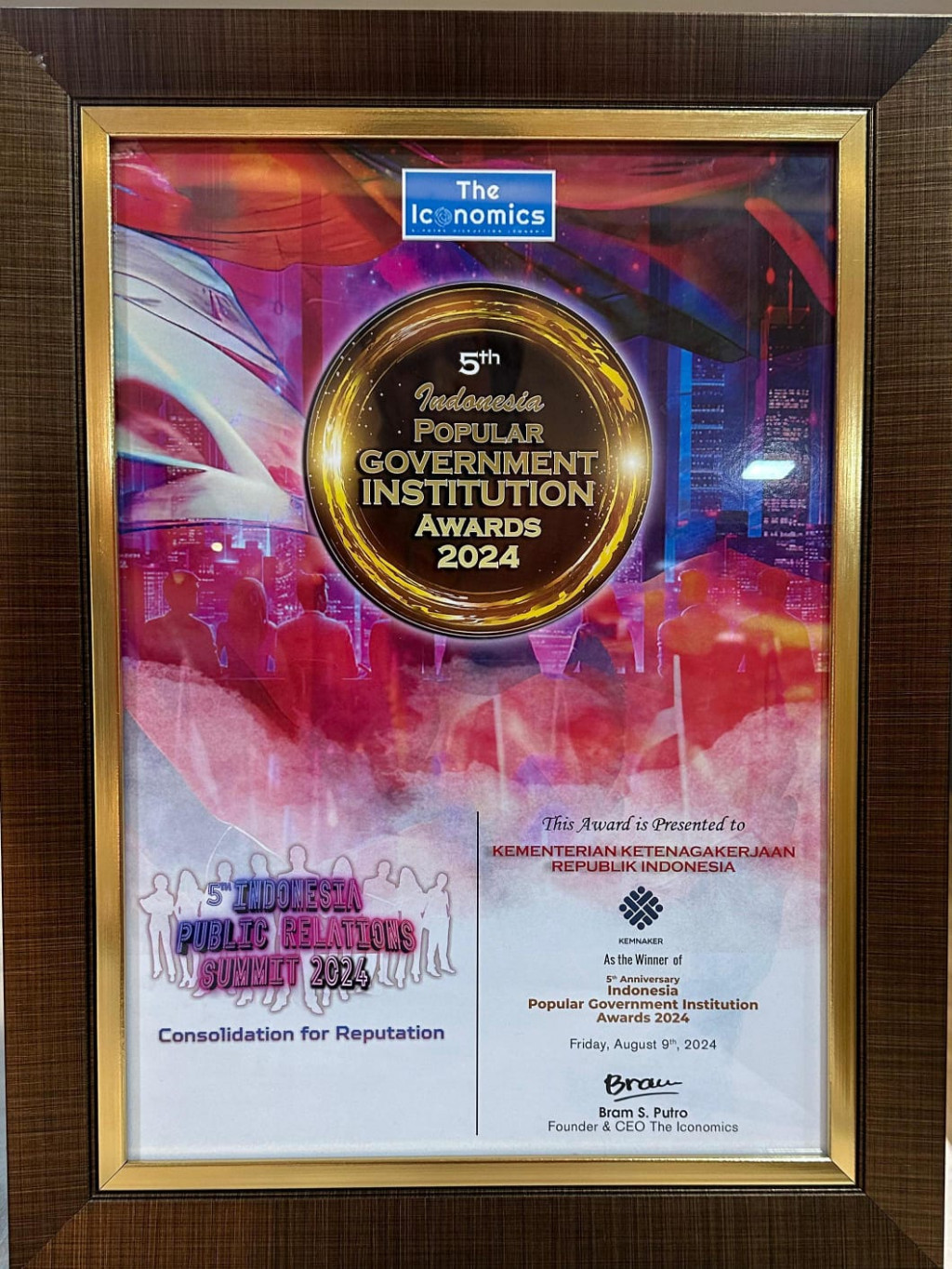 Penghargaan diterima Menteri Ketenagakerjaan (Menaker) Ida Fauziyah yang diwakili Kepala Badan Perencanaan dan Pengembangan (Barenbang) Ketenagakerjaan Kemenaker Estiarty Haryani pada Jumat, 9 Agustus 2024, di Jakarta.