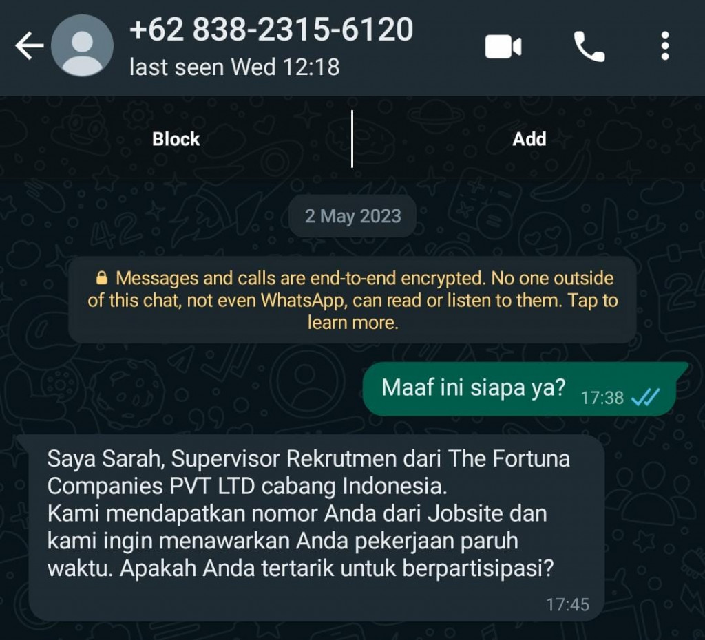 Penipuan Lowongan Kerja via WA (WhatsApp)