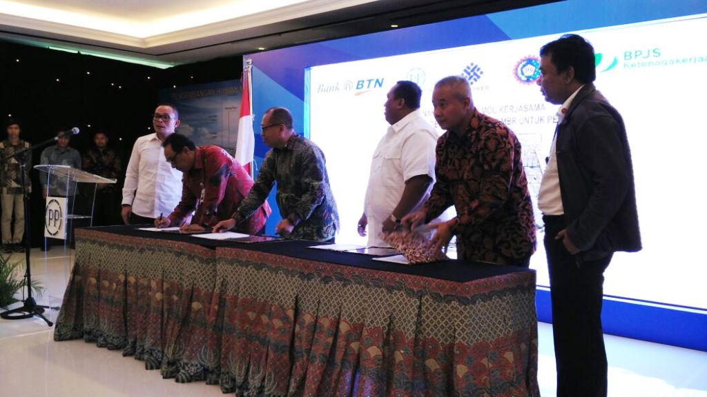 MoU atau penandatanganan kerja sama ini dihadiri oleh Menteri Ketenagakerjaan Hanif Dhakiri, Direktur Utama PTPP Tumiyana, Direktur Utama BTN Maryono, Dirut BPJS Ketenagakerjaan Agus Susanto, dan Presiden KSPSI Andi Gani Nena Wea.