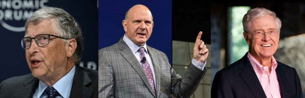 Charles Koch: Telah menyumbang USD1,9 miliar melalui jaringan Stand Together, fokus pada pendidikan dan reformasi hukum.