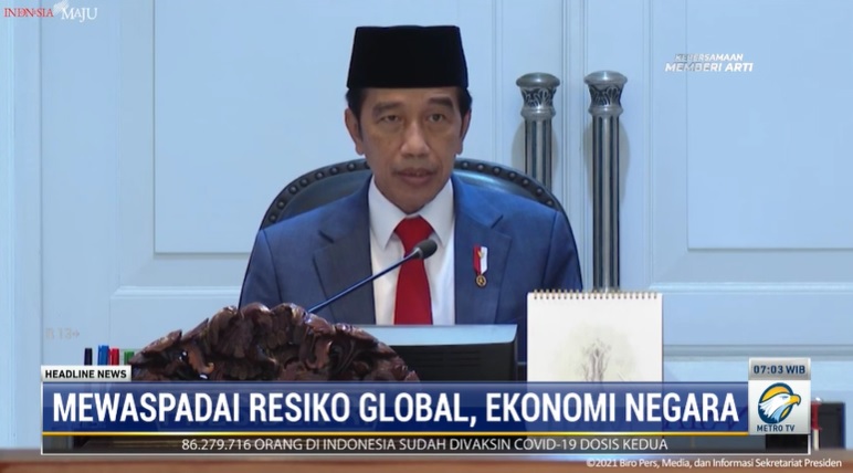 “Berkaitan dengan risiko-risiko global agar semuanya diwaspadai seperti perlambatan ekonomi di Tiongkok. Betul-betul dilihat karena ekspor kita ke sana gede," kata Jokowi dalam rapat kabinet 17 November yang ditayangkan ulang di Headline News di Metro TV, Kamis 18 November 2021.