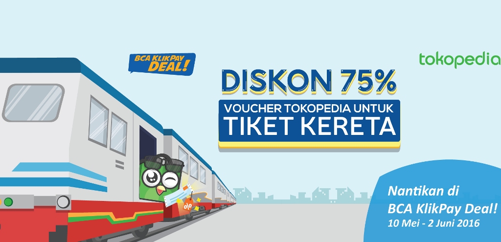 Mengingat liburan sudah dekat, mending pesan tiket dari sekarang supaya tidak kehabisan. Apalagi, ada penawaran menarik dari BCA KlikPay Deal! di Tokopedia untuk pembelian voucher tiket kereta api senilai Rp60 ribu cukup bayar Rp20 ribu pada periode promo 10 Mei - 2 Juni 2016.