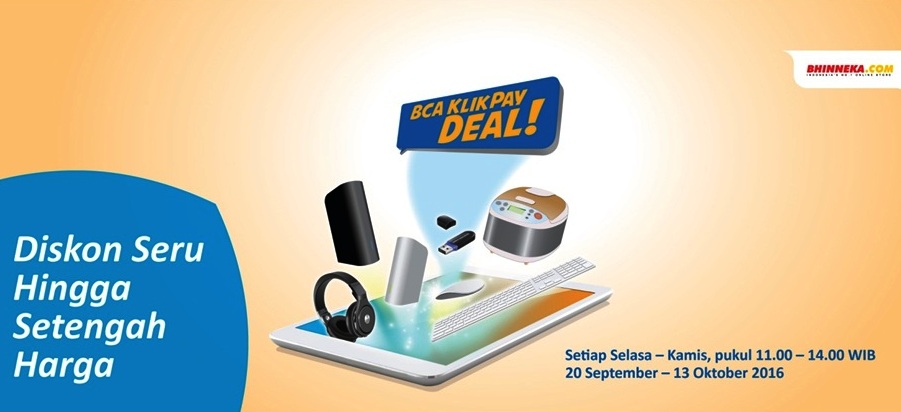 Nah, kabar baiknya, BCA Klikpay Deal!Diskon up to 50% di Bhinneka.com hadir pada 20 September hingga 13 Oktober 2016, setiap Selasa, Rabu, dan Kamis, mulai pukul 11.00 hingga 14.00 WIB, khusus untuk pembelian semua barang yang dijual dan dikirimkan oleh Bhinneka.com.