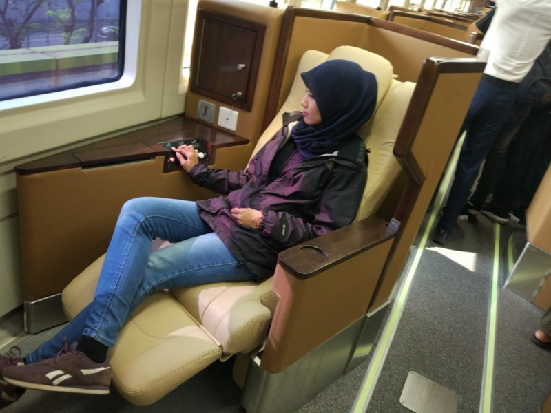 Setelah kursi yang bisa direbahkan 170 derajat, fasilitas yang ada lainnya adalah sandaran kaki. Sandaran kaki elektrik ini memungkinkan penumpang bisa tidur layaknya tidur di tempat tidur karena badan dan kaki bisa diluruskan.