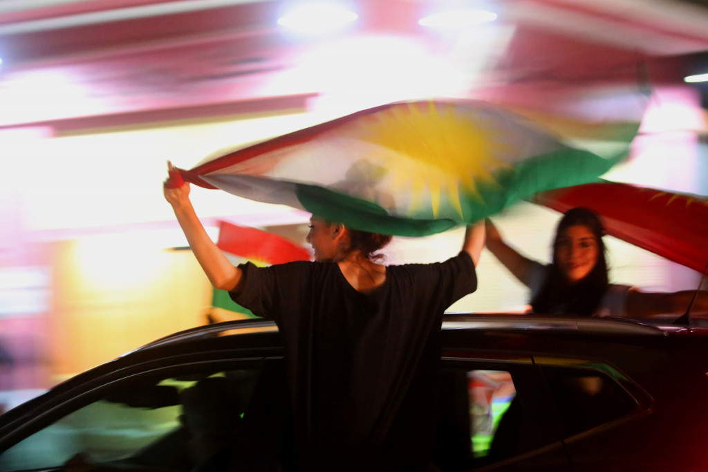 Syrian Kurds wave the Kurdish flag as they celebrate in the northeastern Syrian city of Qamishli on September 25, 2017, in support of the independence referendum in Iraq's autonomous northern Kurdish region. (Photo:AFP/Delil Souleiman)