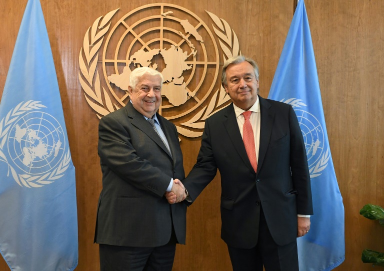 Syria's Foreign Minister Walid al-Muallem (Left) meets UN Secretary General Antonio Guterres at the United Nations in New York on September 21, 2017. (Photo:AFP/Angel Weiss)