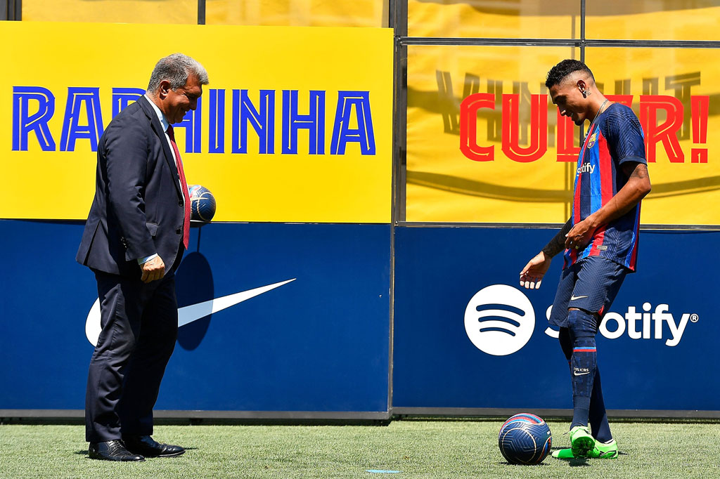 Presiden Barcelona Joan Laporta memberi Raphinha kaus Barca dengan namanya di atasnya, tetapi tanpa nomor, sebelum keduanya menandatangani kontrak, di tempat latihan Joan Gamper, Sant Joan Despi, Barcelona, ??pada Jumat, 15 Juli 2022.