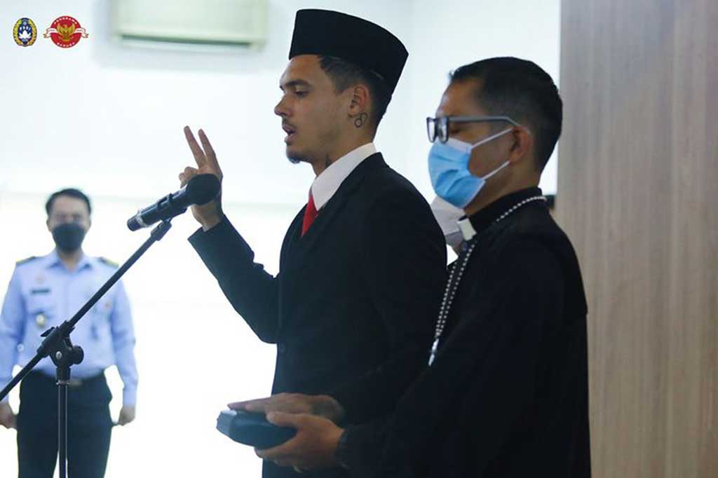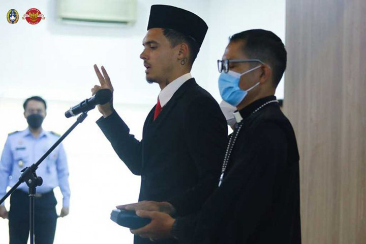 Jakarta: Pemain sepak bola keturunan Belanda, Shayne Pattynama resmi menjadi warga negara Indonesia usai melaksanakan sumpah janji setia WNI di Kantor Wilayah Kementerian Hukum dan Ham (Kanwil Kemenkumham) DKI Jakarta, Selasa, 24 Januari 2023.