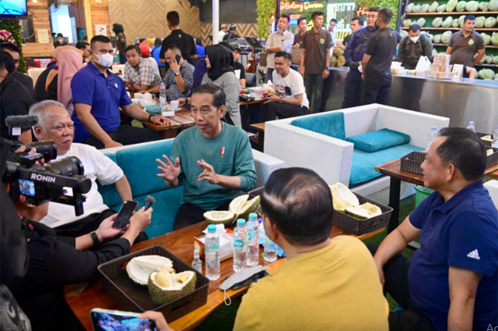 Presiden Joko Widodo merayakan keberhasilan timnas Indonesia merebut medali emas SEA Games 2023 Kamboja dengan mentraktir jajaran menteri serta bawahannya menikmati durian di Medan, Sumatera Utara, Selasa, 16 Mei malam.