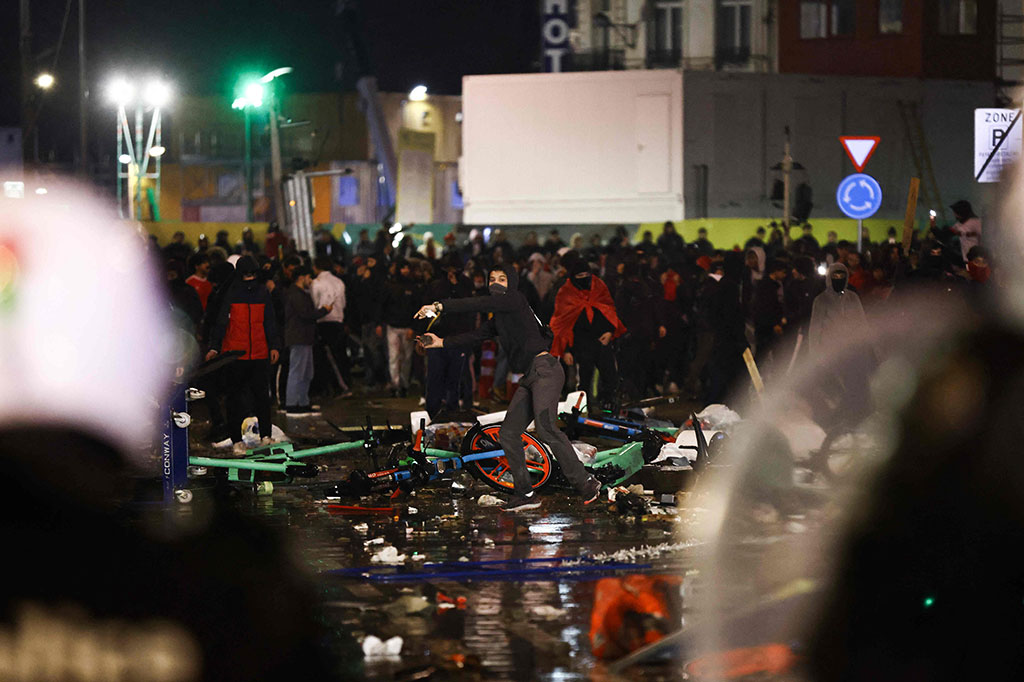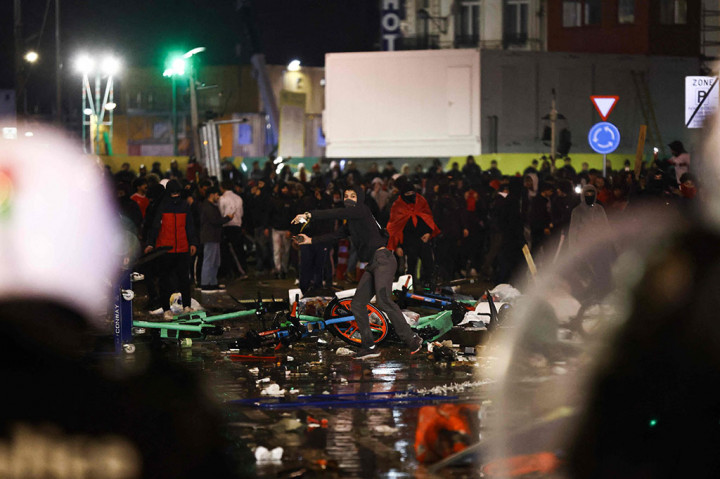 "Saya mengutuk keras insiden sore ini. Polisi telah turun tangan dengan tegas. Oleh karena itu, saya menyarankan agar para fans tidak datang ke pusat kota. Polisi melakukan semua yang mereka bisa demi menjaga ketertiban umum," cuit Wali Kota Brussel, Philippe Close. "Saya telah memerintahkan polisi untuk menangkap para pembuat onar." AFP PHOTO/Kenzo Tribouillard Cek Berita dan Artikel yang lain di Google News