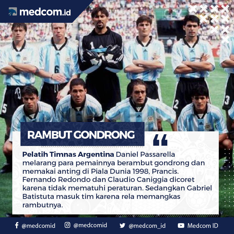 Pelatih Argentina Daniel Passarella membuat kebijakan aneh dengan melarang para pemainnya berambut gondrong pada Piala Dunia 1998 di Prancis.