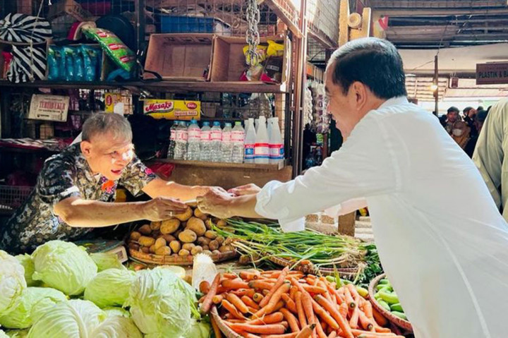 Jakarta: Presiden Joko Widodo mengecek langsung harga sejumlah bahan kebutuhan pokok dan inflasi di Pasar Parungkuda, Kabupaten Sukabumi, Jawa Barat, Jumat, 4 Agustus 2023. Jokowi menyatakan harga bahan pokok banyak yang turun.