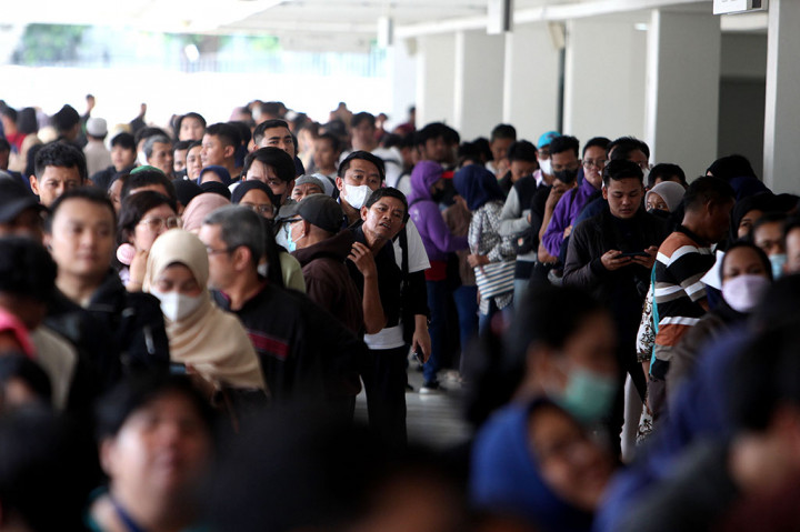 Warga mengantre untuk melakukan pendaftaran penukaran uang di Istora Senayan, Jakarta, Kamis, 28 Maret 2024. Bank Indonesia (BI) bersama 16 perbankan membuka kuota penukaran uang untuk 5.000 orang per hari melalui 'Aplikasi Pintar', dalam layanan kas keliling terpadu di wilayah DKI Jakarta selama 28-31 Maret 2024.