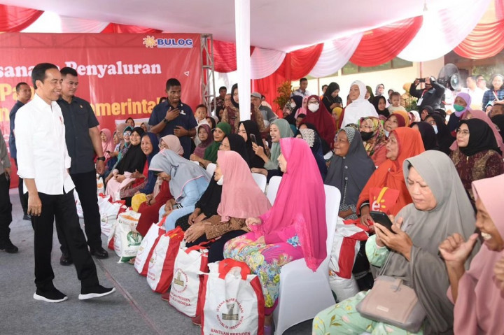 Presiden Jokowi didampingi Menteri Sekretaris Negara Pratikno, Menteri BUMN Erick Thohir, Kepala Badan Pangan Nasional Arief Prasetyo Adi, Direktur Utama Perum Bulog Budi Waseso, Pj Gubernur Jawa Barat Bey Machmudin, dan Bupati Bogor Iwan Setiawan.