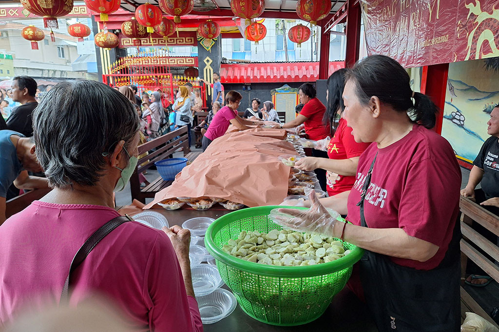 Setiap warga yang datang ke area klenteng disilahkan mengambil, menikmati lontong opor ayam Cap Go Meh sembari menonton pertunjukan liong dan barongsai. Ada juga sajian jenang keranjang goreng dan bubur lolos dari jenang keranjang sebagai kudapan yang bisa dinikmati di sela pesta rakyat.