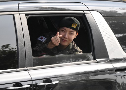 Mengenakan seragam dan baret hitam, J-Hope tersenyum saat menyapa Jin dan sekitar 100 penggemar yang bersorak serta wartawan saat keluar dari pangkalan militer di Wonju, Provinsi Gangwon.