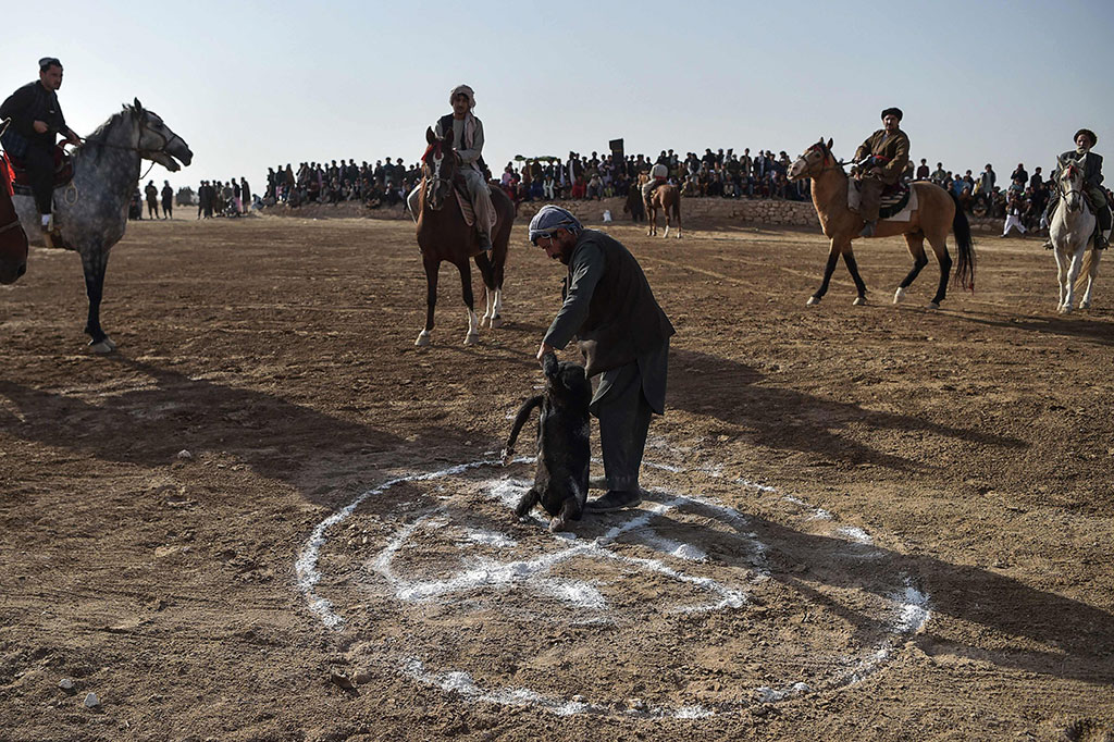 Haji Mohammad Pahlawan mengayunkan cambuknya ke udara, menarik kuda jantan abu-abunya menjauh dari bangkai anak sapi yang baru saja dilemparnya ke gawang untuk meraih kemenangan dalam turnamen buzkashi, olahraga nasional Afghanistan.