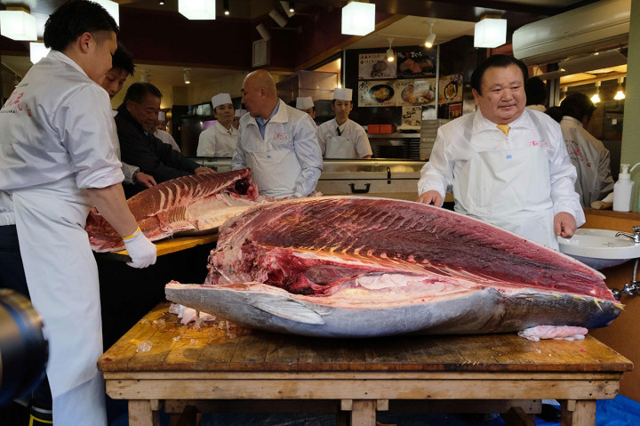 Tokyo: Sebuah rekor lelang ikan tuna raksasa baru saja tercipta di pasar ikan terbesar Jepang, Toyosu, Sabtu, 5 Januari 2019. Seekor tuna sirip biru seberat 278 kg terjual dengan harga 333,6 juta yen atau sekitar Rp 44 miliar. AFP Photo/Kazuhiro Nogi Cek Berita dan Artikel yang lain di Google News