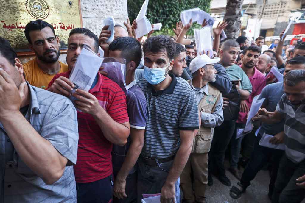 Di Jabalia, sebuah kamp pengungsi di Gaza utara, kerumunan pria yang memegang dokumen identitas mereka berbaris berharap mendapatkan izin untuk bekerja di Israel.