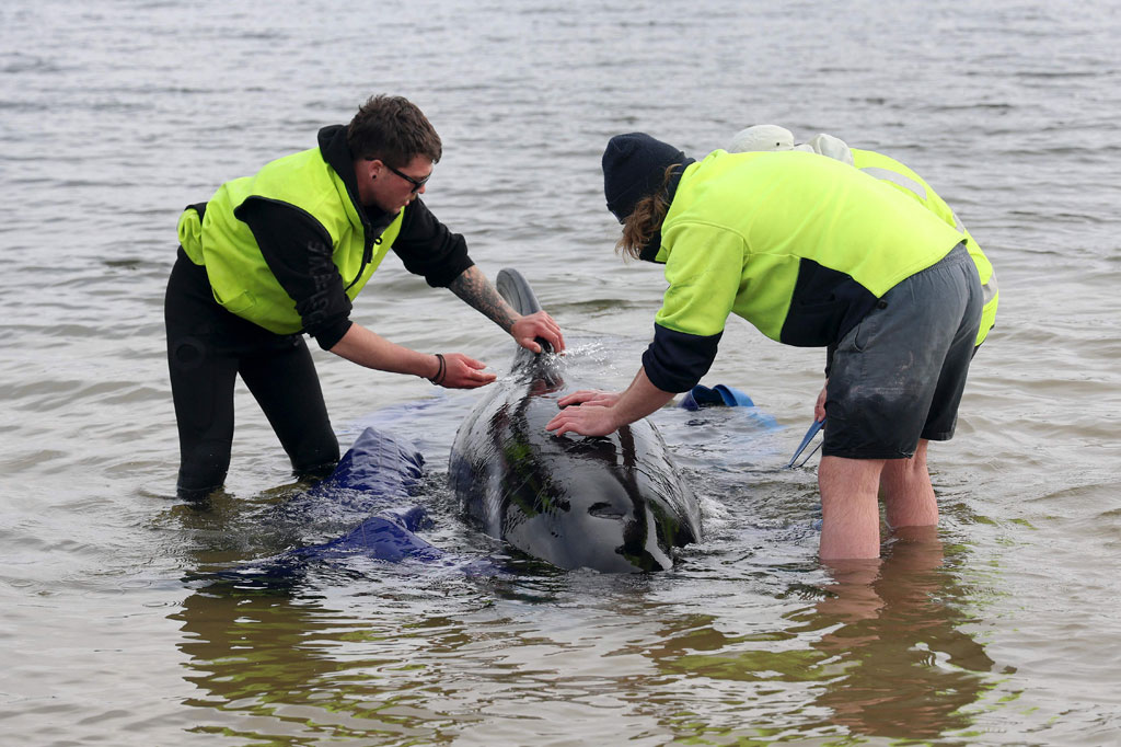 Setelah upaya seharian yang melelahkan dalam kondisi sulit, dinas margasatwa negara bagian mengatakan hanya 34 dari 226 paus pilot bersirip panjang yang terdampar bisa diselamatkan.