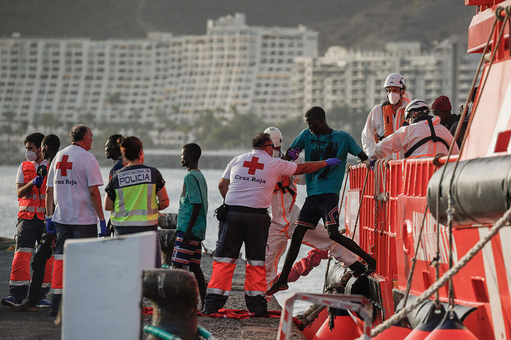 Sebuah kapal penyelamat kemudian membawa para migran ke pelabuhan Arguineguin di Gran Canaria, di mana mereka disambut pekerja Palang Merah yang memberi mereka perawatan medis.
