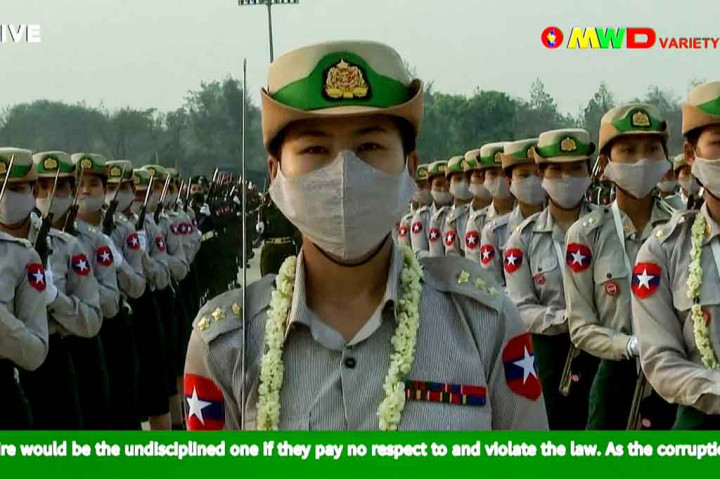Ketika pasukan membawa obor dan bendera sambil berbaris di samping kendaraan militer, pemimpin junta Jenderal Min Aung Hlaing kembali membela kudeta dan berjanji untuk menyerahkan kekuasaan setelah pemilihan baru.