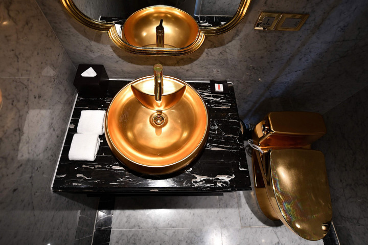 Bukan hanya dinding yang dilapisi emas 24 karat, tetapi seluruh lobi, kolam renang terbuka dan kamar-kamar dengan peralatan makan, gelas, keran air, dan toilet juga berlapis logam mulia tersebut.