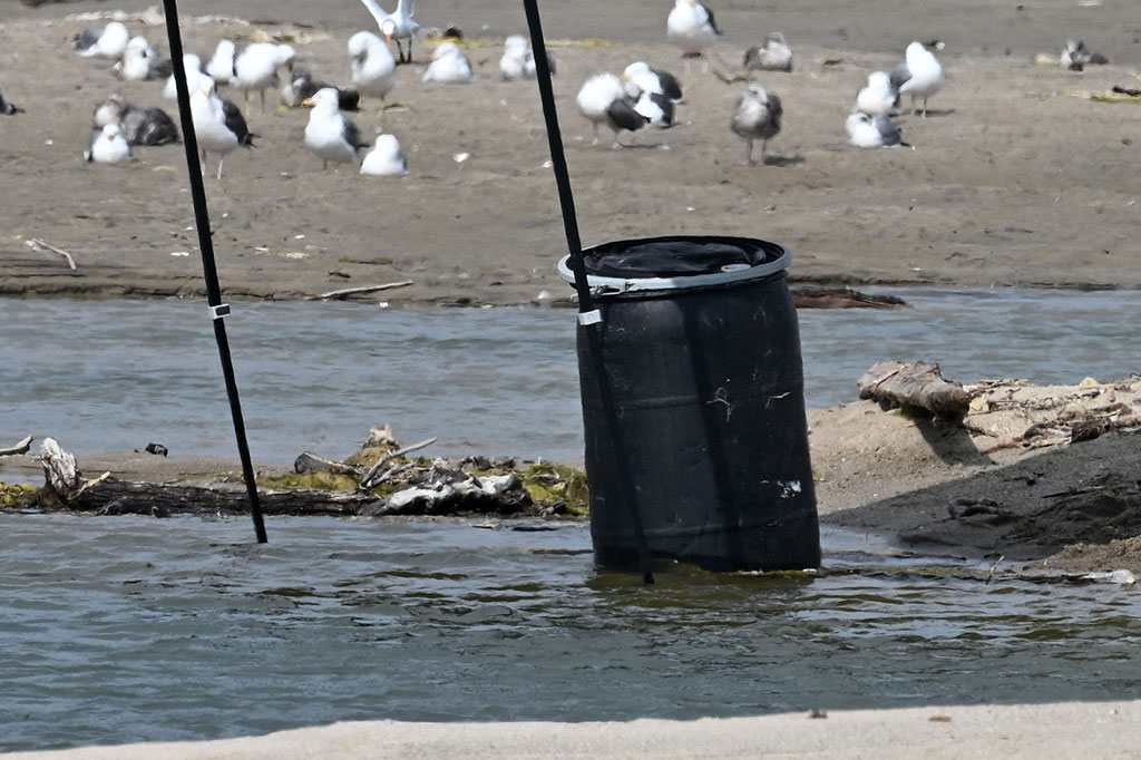 Foto AFP menunjukkan tong tertutup diletakkan tegak di perairan dangkal di dekat Dermaga Malibu.