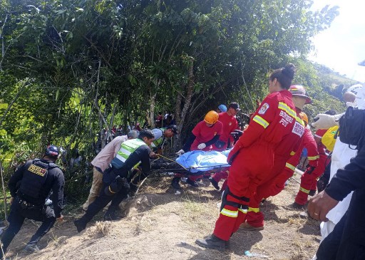 Bus tersebut mengalami kecelakaan saat melaju di sepanjang jalan di provinsi Moyobamba, di wilayah San Marin. AFP PHOTO/Direcction de Salud Region San Martin