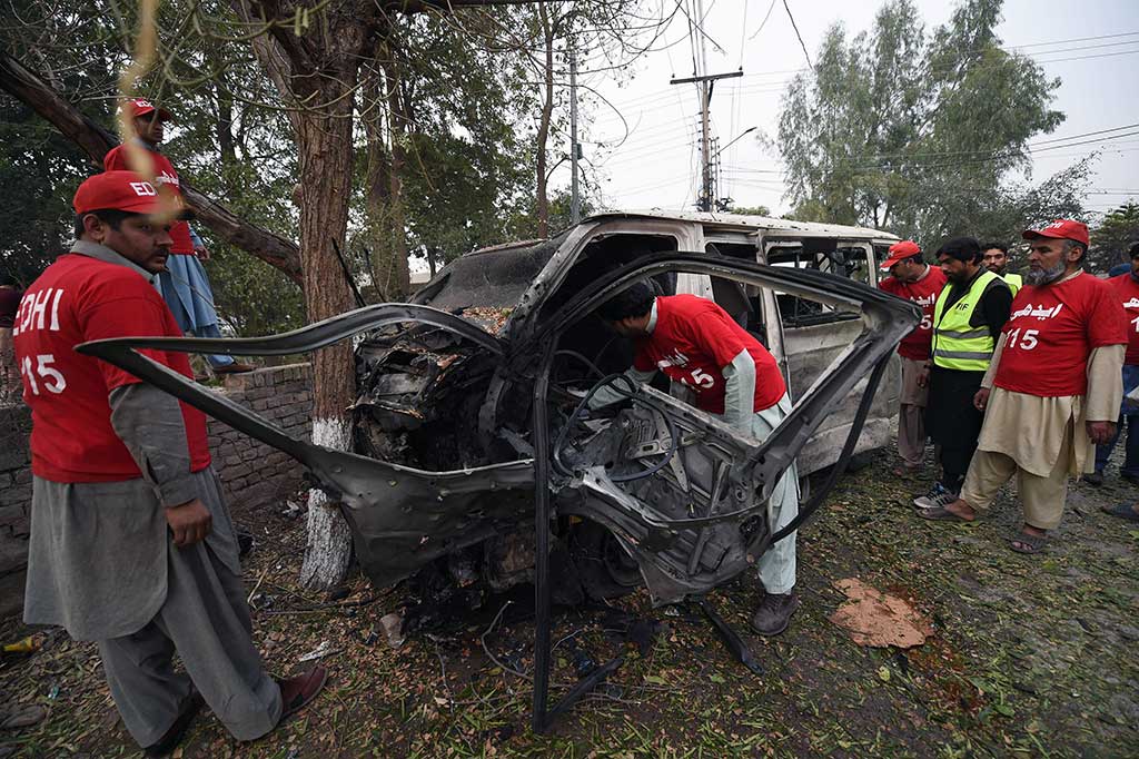 Relawan mencari korban di dalam van yang hancur setelah serangan bom bunuh diri di Peshawar, Pakistan, Rabu (15/2/2017).