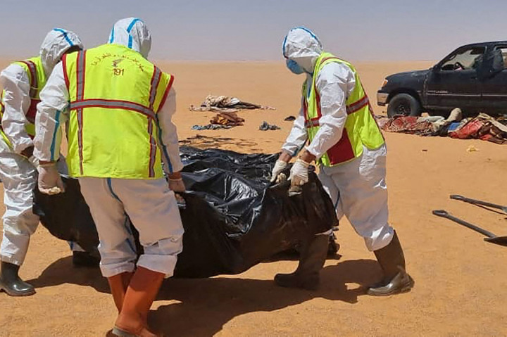 Ribuan orang melintasinya setiap tahun dalam upaya mencapai pantai Mediterania dan akhirnya Eropa, tetapi banyak yang mati dalam perjalanan, termasuk di gurun Sahara yang keras. AFP PHOTO/Libya Ambulance Service/Kufra Rescue and Emergency Service Cek Berita dan Artikel yang lain di Google News