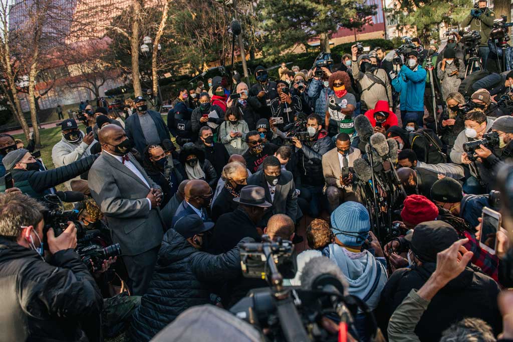 Sharpton dan Crump, yang berspesialisasi dalam kasus-kasus kebrutalan polisi terhadap orang Afrika-Amerika, berkumpul bersama saudara laki-laki Floyd dan keponakannya di alun-alun di seberang gedung pengadilan tempat pembukaan argumen dalam persidangan luar biasa dimulai Senin.