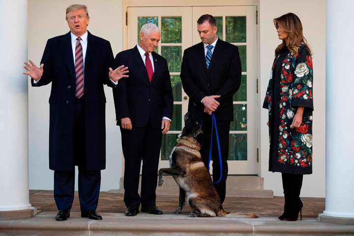 Washington DC: Presiden Amerika Serikat (AS) Donald Trump, Senin, 25 November 2019 waktu setempat, memperkenalkan Conan, anjing militer yang menjadi pahlawan karena perannya dalam razia yang menewaskan pemimpin Islamic State (IS) Abu Bakr al-Baghdadi. AFP Photo/Jim Watson/Eric Baradat Cek Berita dan Artikel yang lain di Google News