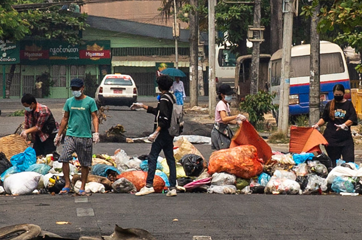 Yangon: Sejumlah pengunjuk rasa membuang sampah di jalan saat demonstrasi menentang kudeta militer di Kota Thaketa Yangon, Myanmar, Selasa, 30 Maret 2021.