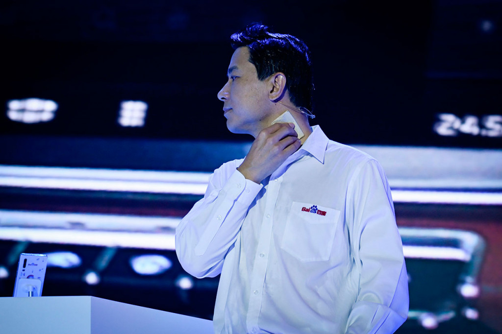 Beijing: CEO Baidu, mesin pencari atau search engine asal Tiongkok, Robin Li disiram air saat menyampaikan presentasi di sebuah acara konferensi teknologi kecerdasan buatan (AI) di Beijing, Rabu, 3 Juli 2019. AFP Photo/AFPTV/Qian Ye/Wang Zhao Cek Berita dan Artikel yang lain di Google News