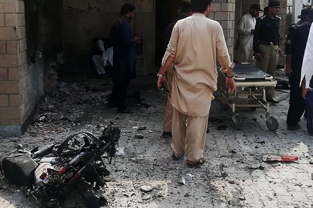 "Pembom wanita, berusia sekitar 28 tahun, datang dengan berjalan kaki dan meledakkan dirinya, menewaskan dua polisi dan empat warga sipil dan melukai 13 lainnya," kata Kepala Polisi Distrik Salim Riaz. "Yang terluka termasuk delapan polisi dan lima warga sipil."