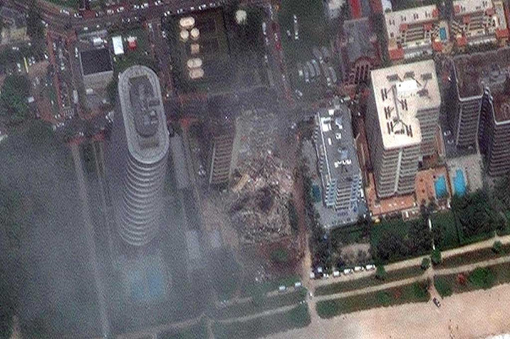 Video yang diambil oleh kamera keamanan menunjukkan seluruh sisi bangunan tiba-tiba terlipat menjadi dua bagian, satu demi satu, sekitar pukul 01:30 (0530 GMT), mengeluarkan awan debu.