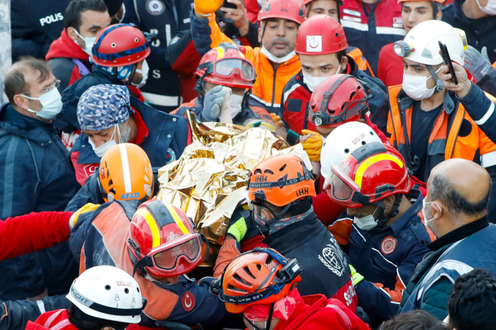 Izmir: Tim penyelamat berhasil mengevakuasi dua anak dari reruntuhan di sebuah kota di Turki pada Senin, 2 November 2020. Hal tersebut memberikan harapan yang menggembirakan setelah hampir tiga hari gempa kuat melanda Laut Aegea, menewaskan 94 orang dan menghancurkan puluhan bangunan.