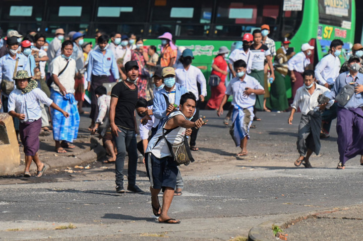 "Pada siang hari, bentrokan meletus di dekat kompleks Stasiun Kereta Api Yangon, dengan pendukung militer yang membawa pipa, pisau, dan ketapel berbalik menyerang warga yang mengejek mereka," kata saksi mata.