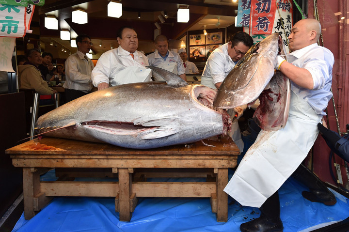 Tokyo: Seorang pengusaha sushi terkenal Jepang yang dijuluki 'Tuna King', membayar USD1,8 juta (sekitar Rp25 miliar) untuk tuna raksasa di lelang Tahun Baru, di pasar ikan utama Tokyo pada Minggu, 5 Januari 2020. AFP Photo/Kazuhuro Nogi Cek Berita dan Artikel yang lain di Google News