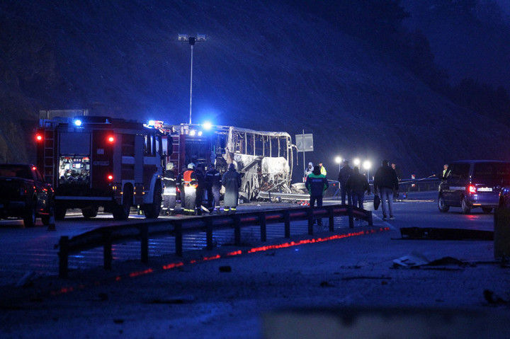 Penyebab kecelakaan belum diketahui, namun para pejabat meyakini kebakaran terjadi setelah bus menabrak pagar pembatas. AFP PHOTO/Dimitar Kyosemarliev Cek Berita dan Artikel yang lain di Google News